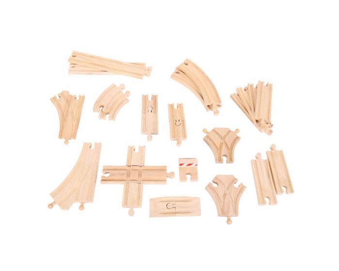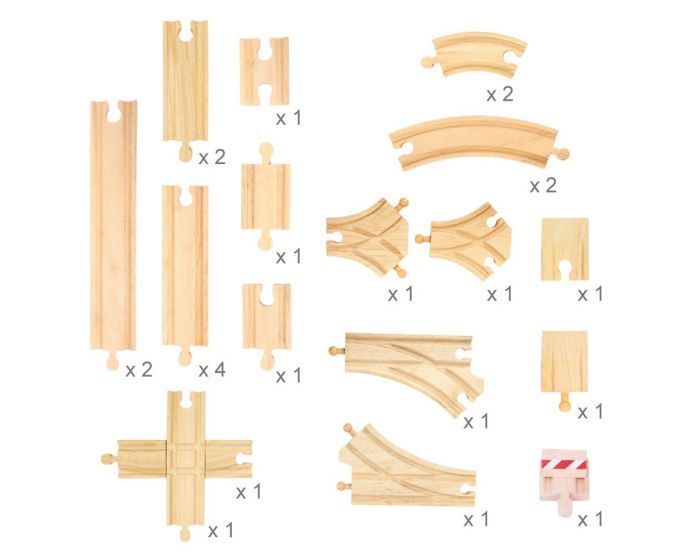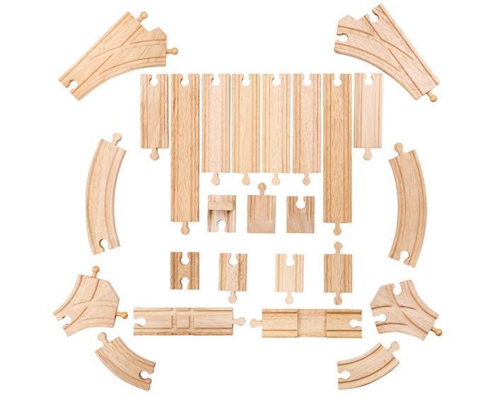 Set obsahuje 25 kusov kvalitných drevených dielov koľajníc, ktorý možno pridať k akejkoľvek existujúcej kolekcii vláčikodráhy.