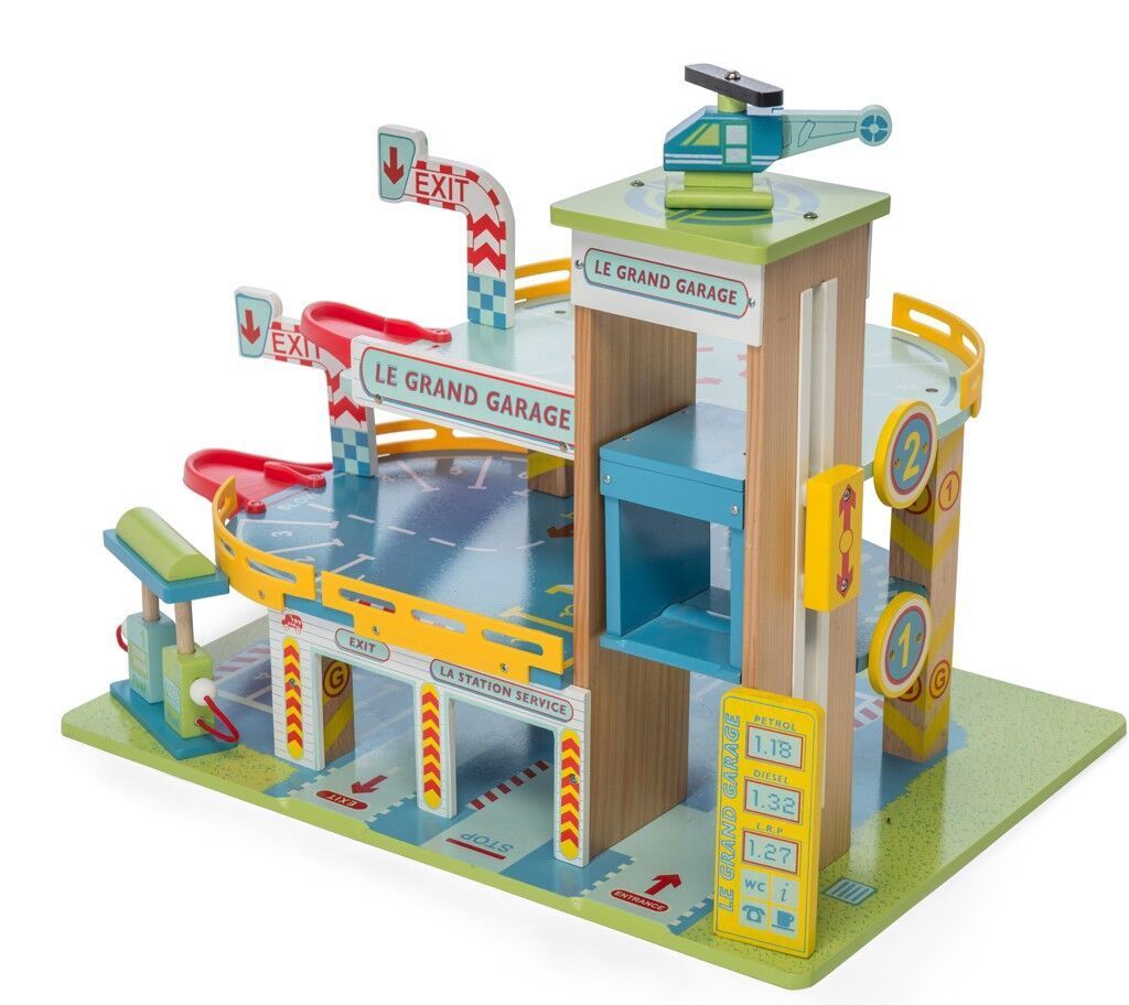 Krásna trojposchodová drevená garáž s dvoma špirálovými rampami a fungujúcim výťahom. Táto krásna garáž má v balení tiež auto, helikoptéru a čerpaciu stanicu. Garáž je kompatibilná s autíčkami Le Toy Van. Dizajn s číslami pomáha s ich precvičovaním počas hry.