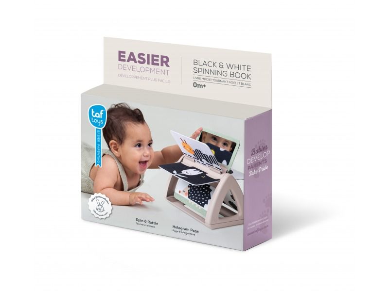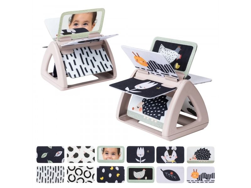 - Od 2 mesiacov: výrazné obrázky, bezpečné zrkadlo, hologramový trblietavý obrázok a hrkajúci zvuk pri otáčaní jednotlivých stránok upútajú pozornosť dieťaťa pri hre na brušku