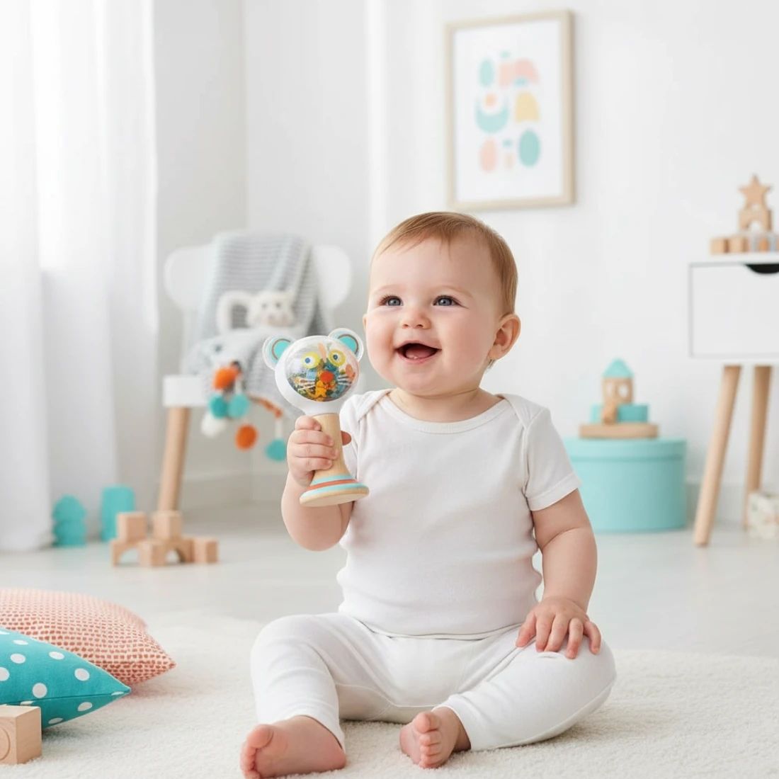 Hrkálka Rumba guľa Lev je zmyslová hračka pre bábätká, ktorá kombinuje jemné hrkanie, pohyb a zvedavosť. Vnútri sa pri zatrasení a kotúľaní presýpajú korálky, ktoré vytvárajú príjemný zvuk a motivujú dieťa skúmať hračku opakovane.