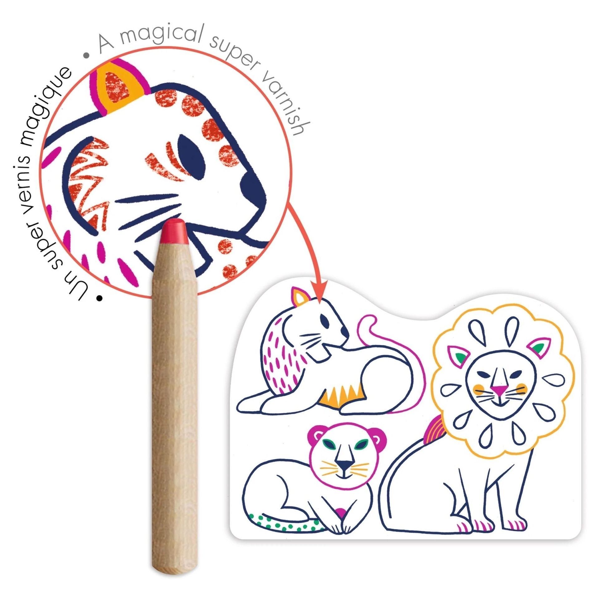 Magické vyfarbovanie farbičkou Rodinky z divočiny od značky Djeco je tvorivá sada pre malé deti, ktoré rady čmárajú a vyfarbujú – a milujú prekvapenia. Na prvý pohľad jednoduché obrázky zvieracích rodiniek sa pri vyfarbovaní zmenia: farbička označí len vybrané miesta a postupne tak odhalí skryté vzory, detaily a línie.