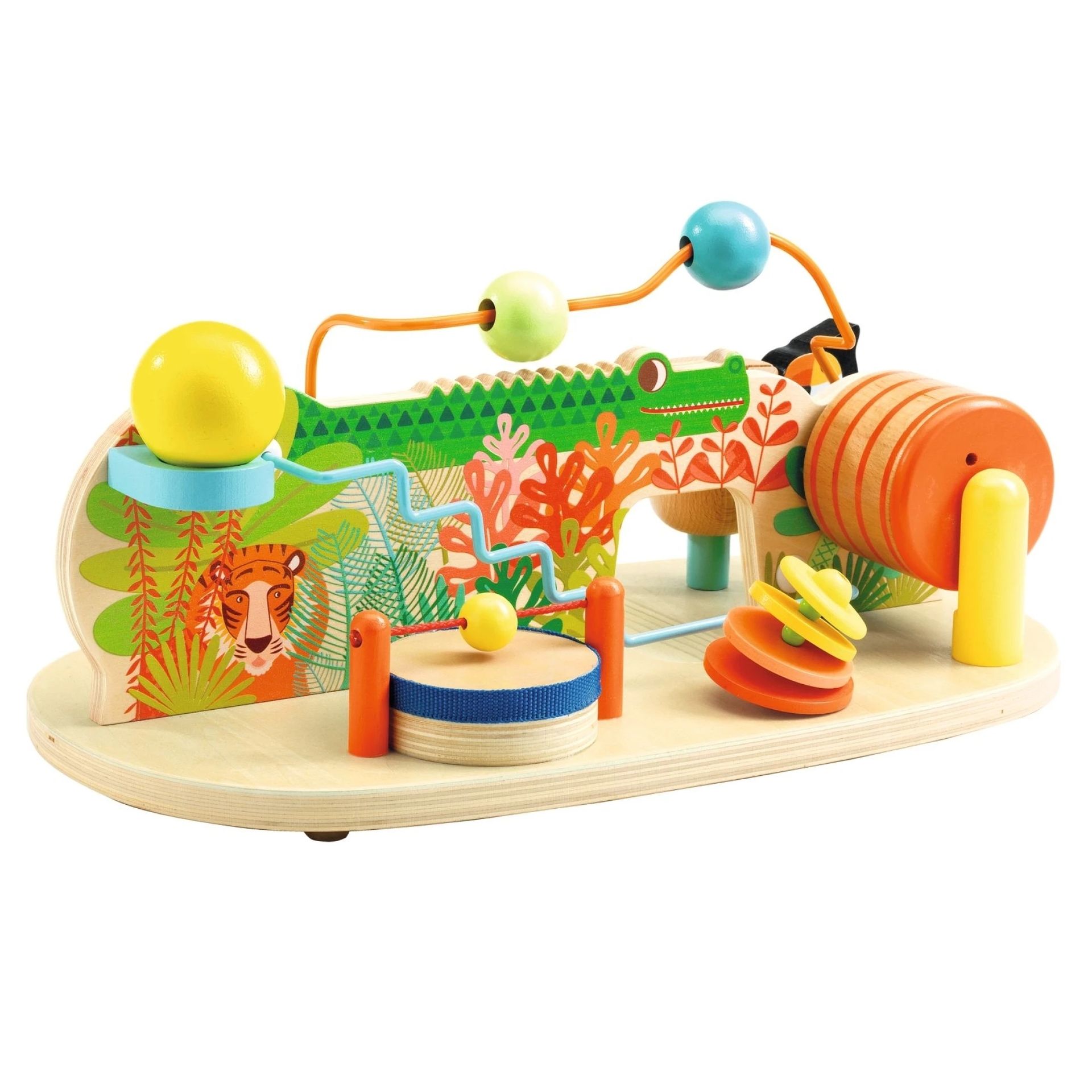 Drevený edukačný stolík pre deti s 8 zvukovými aktivitami rozvíja sluch, jemnú motoriku a koordináciu ruka–oko. Hračka bez batérií, vhodná pre deti od 18 mesiacov.