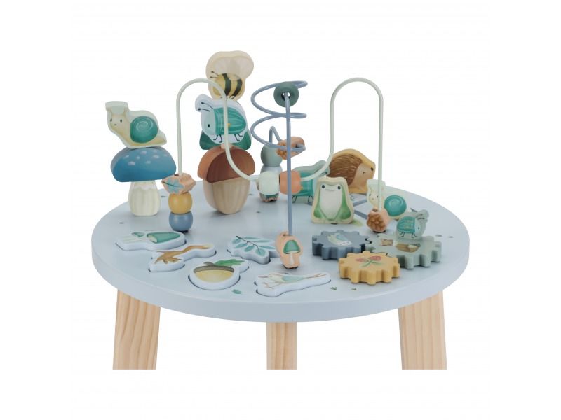 Drevený multifunkčný stolík v krásnom a vysoko kvalitnom prevedení ponúka vášmu dieťaťu množstvo rôznorodých aktivít, ktoré dieťa zabavia a zároveň pomáhajú rozvíjať jeho jemnú motoriku aj jednotlivé zmysly. Lákať dieťa na skúmanie budú pohyblivé, posuvné aj odnímateľné drevené diely v podobe ježka, slimáka, žaby, hubiek a ďalších motívov zo života v lese.