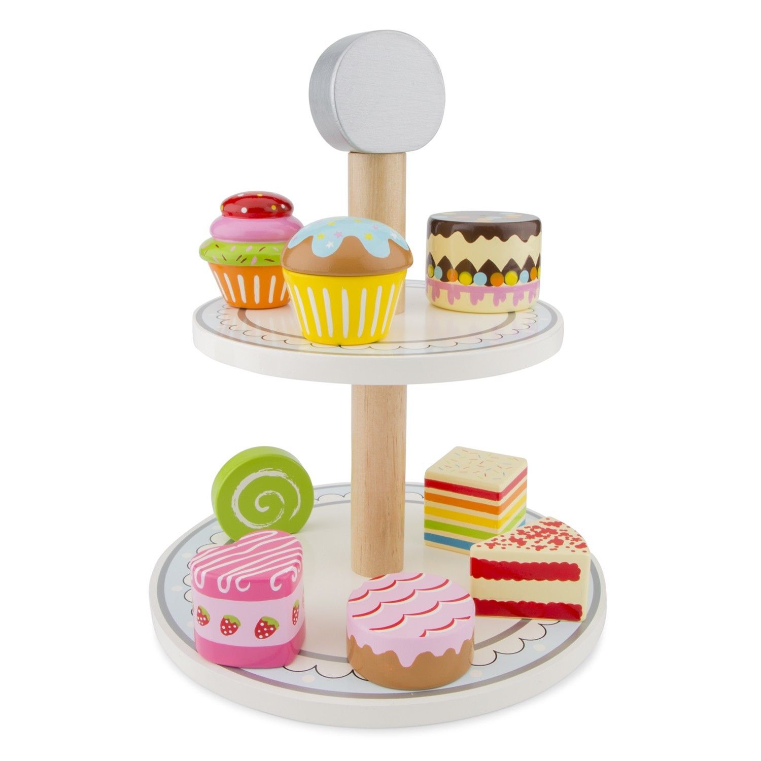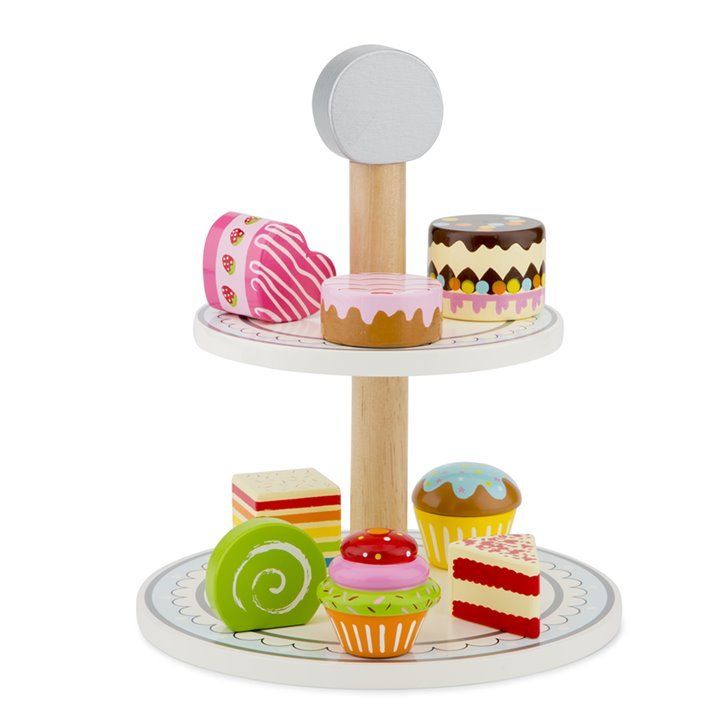 Drevený etažér alebo teda poschodový podnos je krásnym doplnkom k detským kuchynkám, ale deti sa zahrajú aj bez kuchynky. Dodáva sa s ôsmymi rôznymi koláčikmi a okrem toho že rozvíja detskú hru a fantáziu, ukladaním koláčikov sa u detí rozvíja aj jemná motorika.