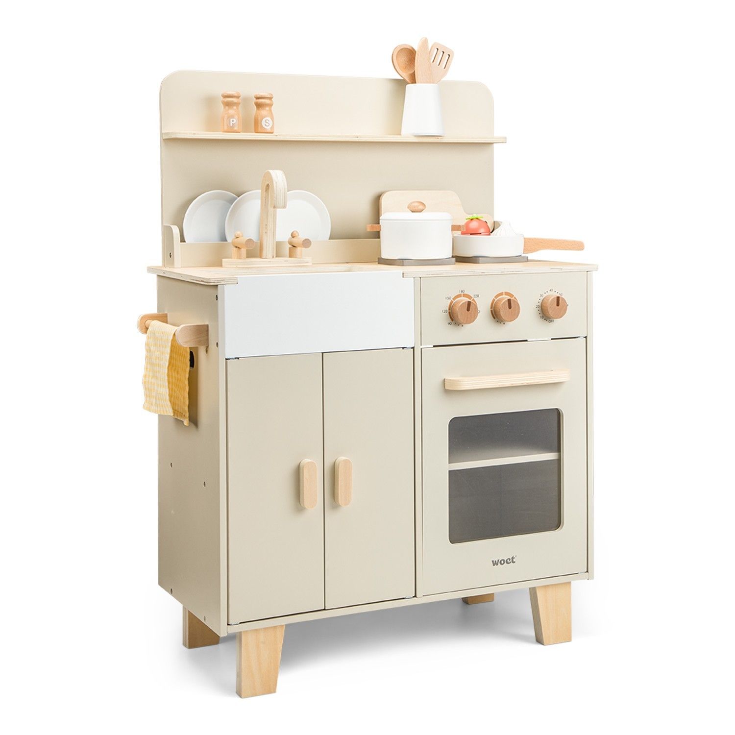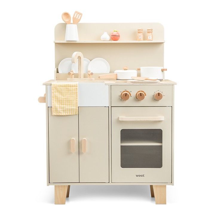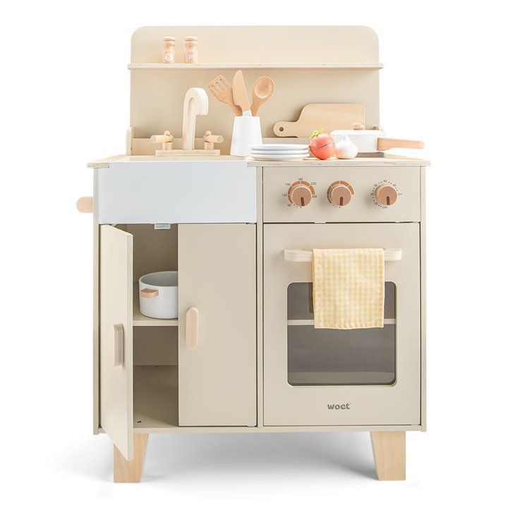 Táto béžová drevená kuchynka na hranie od Woet® má všetko, čo malí kuchári potrebujú na vytvorenie vlastných kulinárskych dobrodružstiev. Vďaka jemným pastelovým tónom, akcentom z prírodného dreva a nadčasovému dizajnu krásne zapadne do každého interiéru a pozýva deti na varenie, tvorenie a spoločné hranie.