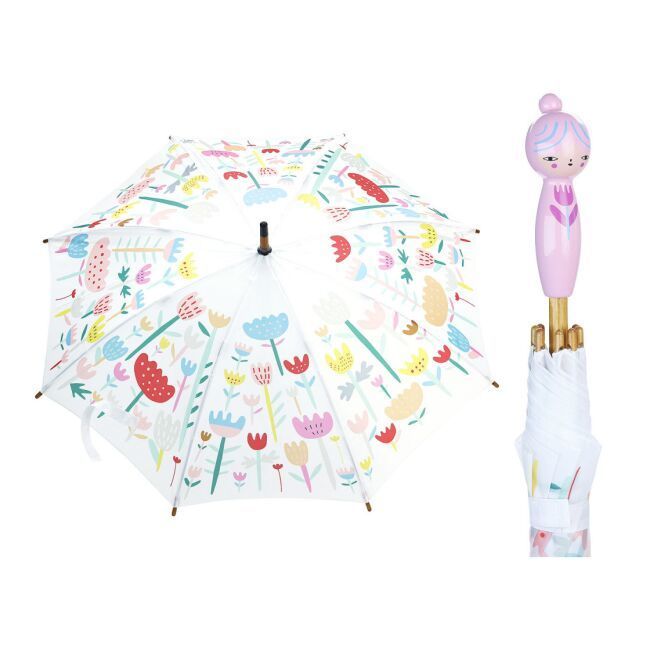 Pekný biely dáždnik s rukoväťou v podobe kvetinovej bábiky a potlačou kvetín rôznych veľkostí i farieb od Suzy Ultman. Vyrobené vo Francúzsku.